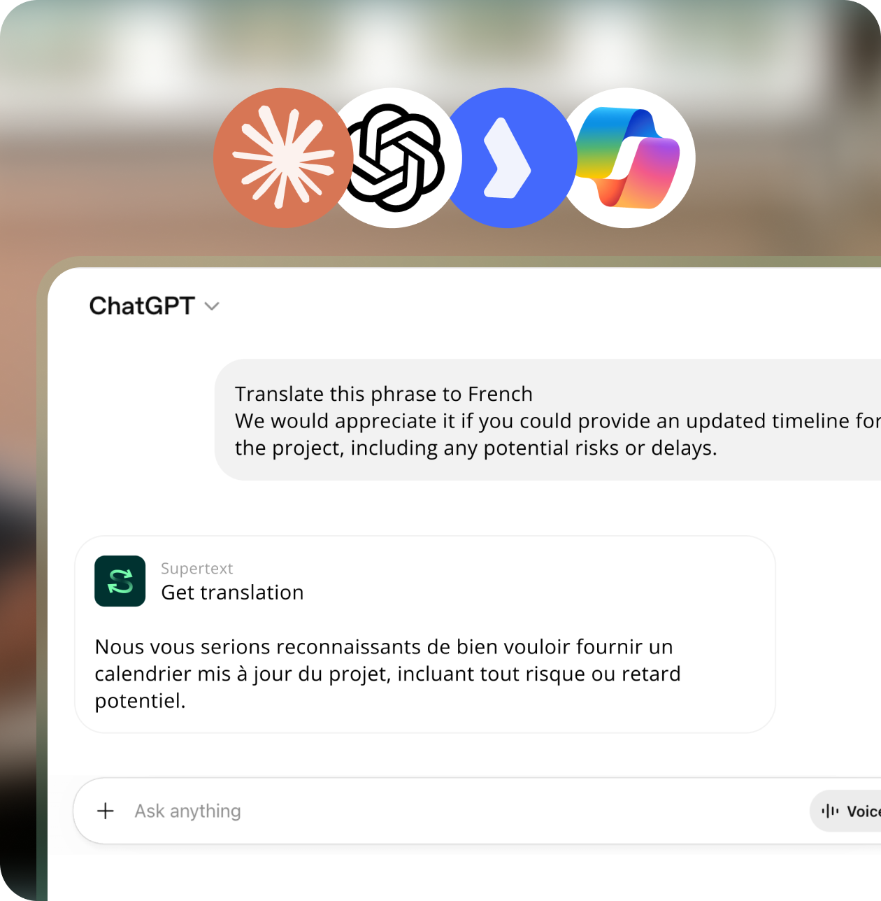 Supertext runs right inside the AI assistants your teams already use, enabling professional multilingual communication without new platforms or fragmented workflows.